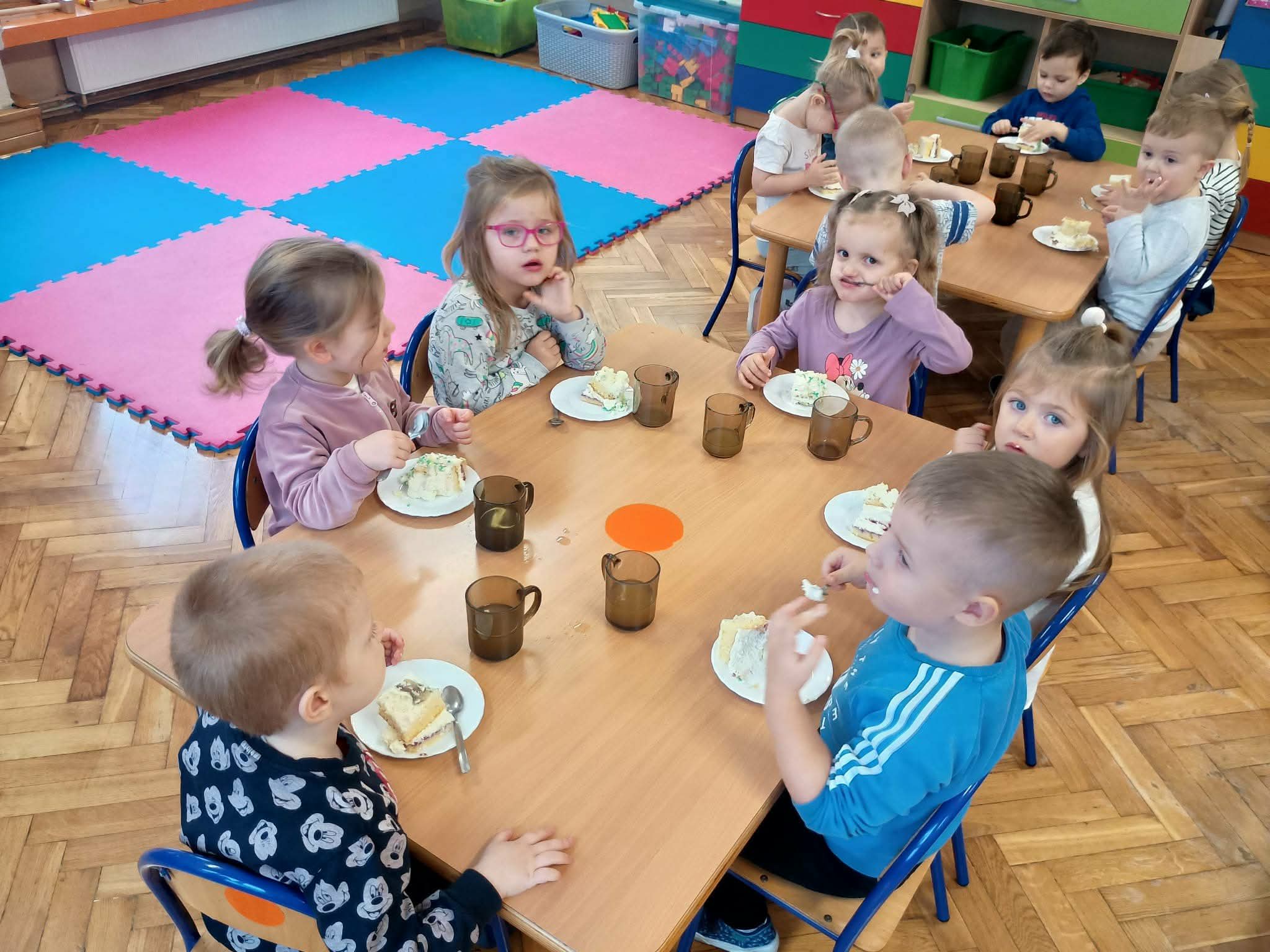 W tym roku naszą uroczystość zaczęliśmy od przywitania wszystkich przedszkolaków i ich misiów, następnie bawiliśmy się przy misiowych przebojach, rozmawialiśmy o znanych i lubianych misiach z dziecięcych bajek. Na koniec czekała na dzieci słodka niespodzianka „ misiowy tort”