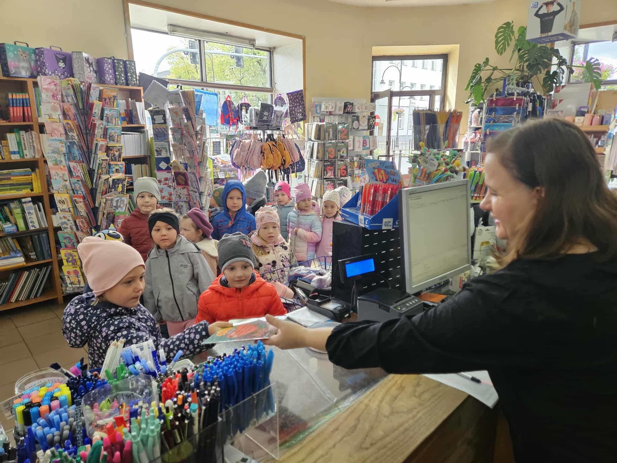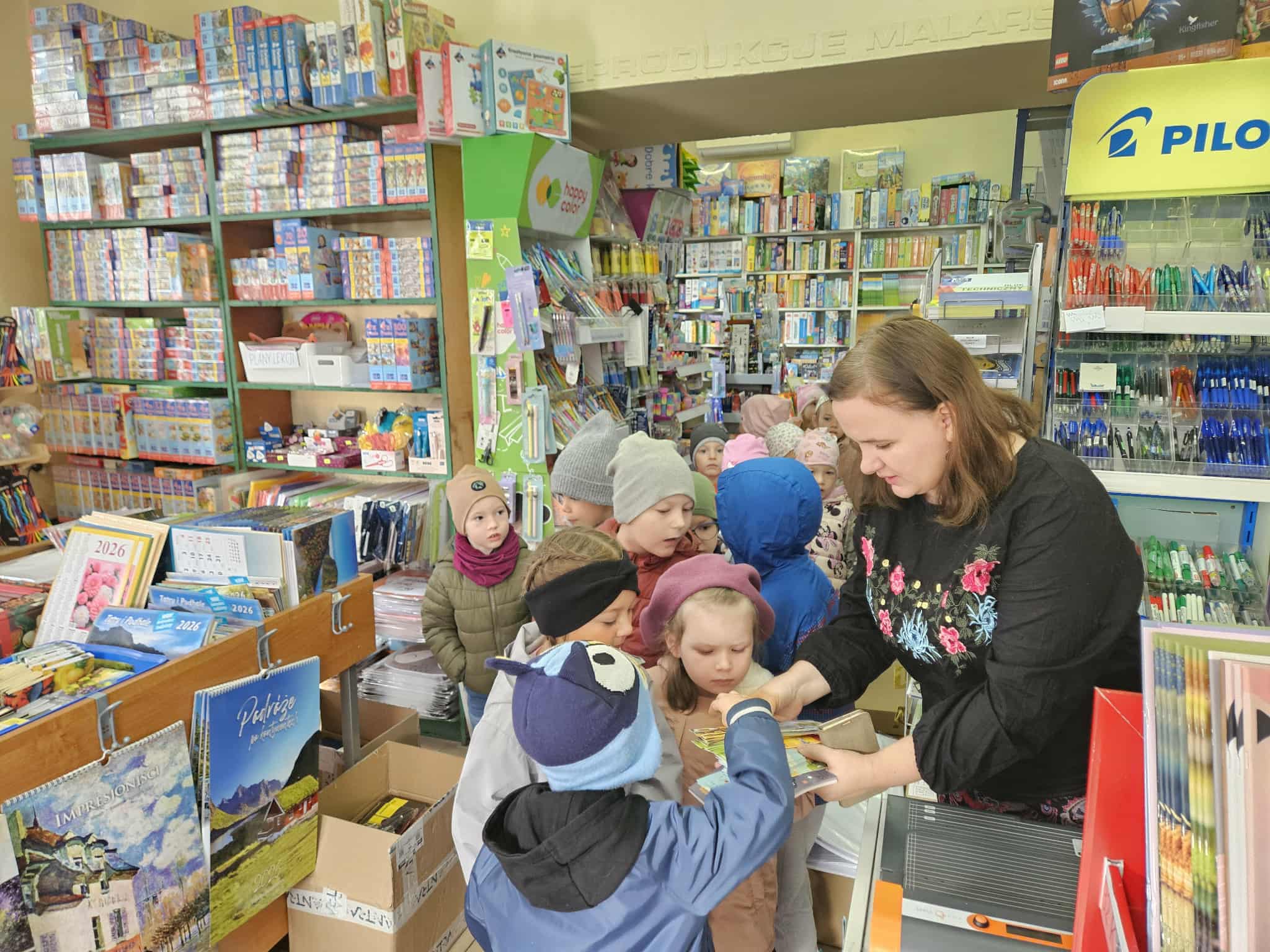 Przedszkolaki z grupy III udały się na wycieczkę do najstarszej zduńskowolskiej księgarni. Dzieci miały okazję poznać pracę księgarza oraz zwiedzić cały sklep poznając jego poszczególne działy oraz asortyment jaki oferuje. Na koniec otrzymały od przemiłej ekspedientki kolorowe naklejki z ulubionymi bohaterami dziecięcej literatury oraz zakładki do książek. Postanowiliśmy także zakupić dwie nowe pozycje do naszego kącika czytelniczego z serii Żubr Pompik - Wyprawy.